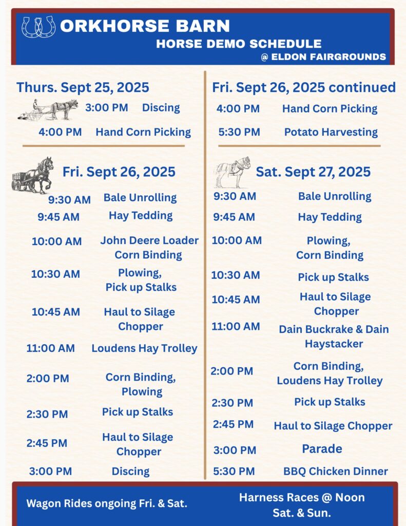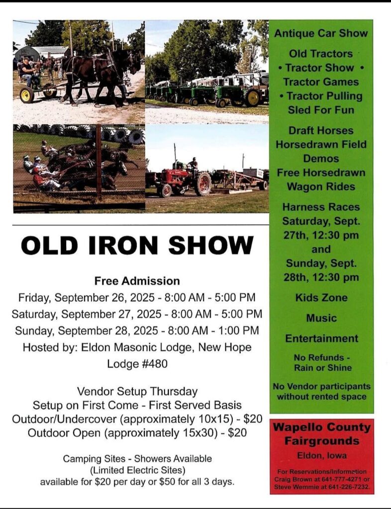 You’re invited to attend or exhibit at the 2025 Old Iron Show, happening in Eldon, Iowa, on September 26th-28th, featuring an array of antique cars, tractors, horses, traction steam engines, and engaging demonstrations, such as plowing, corn binding, steam-powered sawmill and threshing, wagon rides, and more, plus vendors, camping, food, and a swap meet.